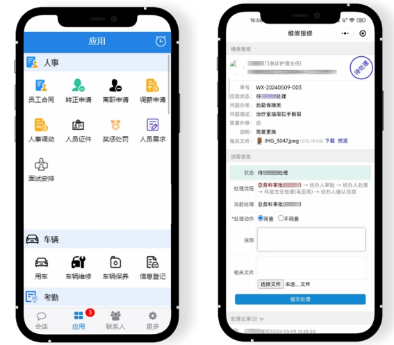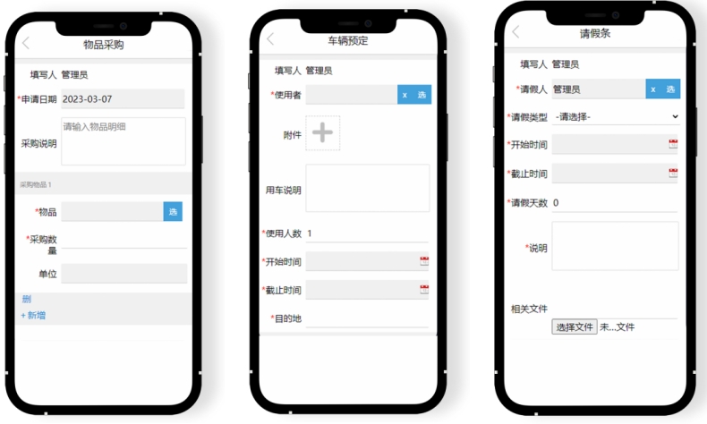 “物品采购”、“车辆预定”、“请假条”等OA审批细节页展示↓界面功能一目了然,该院员工可快速掌握操作办法、提交各项办公需求。