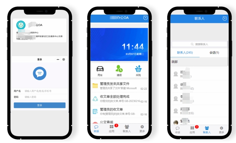 该小程序设置了隐私权限,仅单位员工能输入用户名、密码登录,内置“会话、应用、联系人、更多”四大模块,提供“人事(员工合同、转正申请、离职申请、调薪申请、人事调动、人员证件、奖惩处罚、人员需求、面试安排),车辆(用车、车辆维修、车辆保养、信息登记),考勤(考勤打卡、签到、请假、补卡、考勤统计、外出、出差、加班)等多重审批服务。