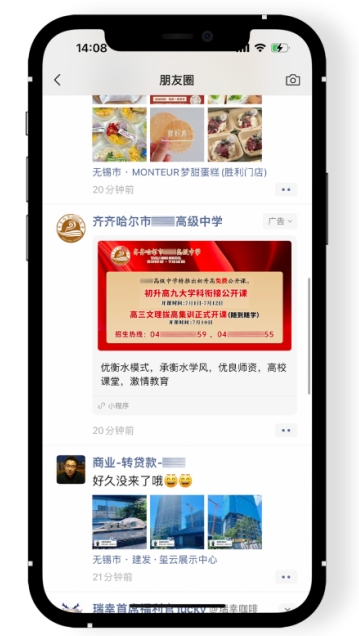 澳云软件凭借专业的推广能力,为齐齐哈尔XX高级中学成功完成了朋友圈广告投放任务。