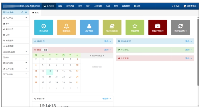 围绕XX制冷设备公司仅需实现“线上付款申请功能”这一需求,我司为其开发了“XX制冷设备OA办公系统”,系统内包含“个人办公、流程、任务资源、公文、客户、人事考勤、行政、财务、流程模块”等多个办公栏目。